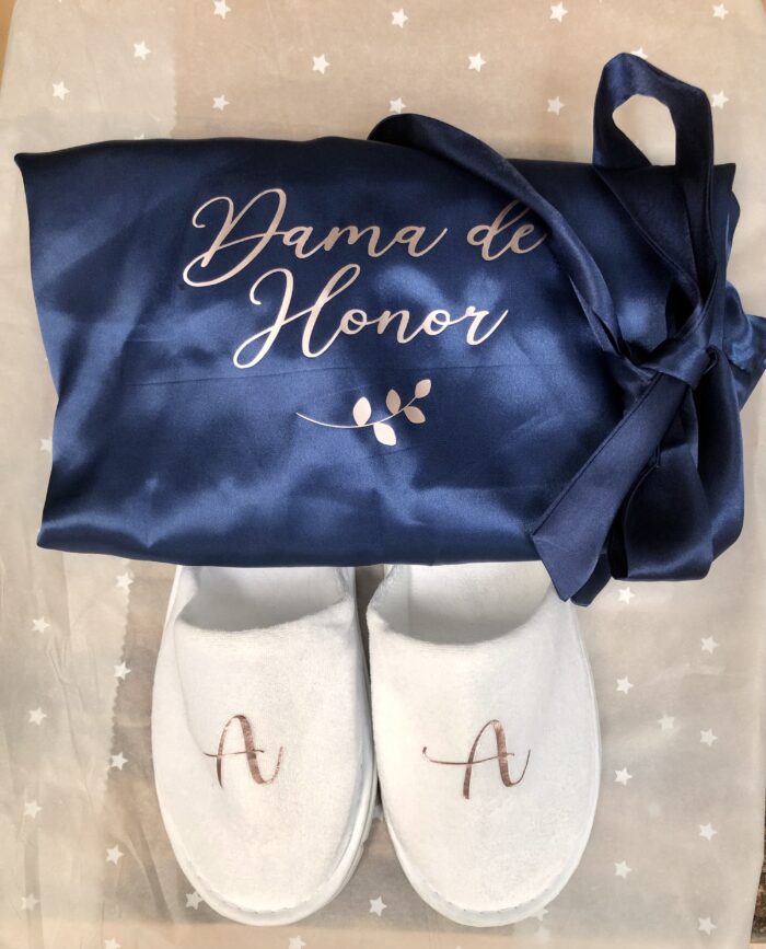 La personalización de la batita y las pantuflas se realiza con vinilo textil termoadhesivo.