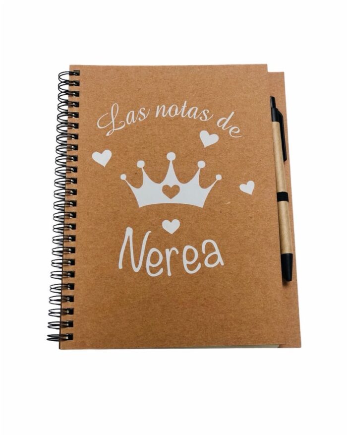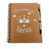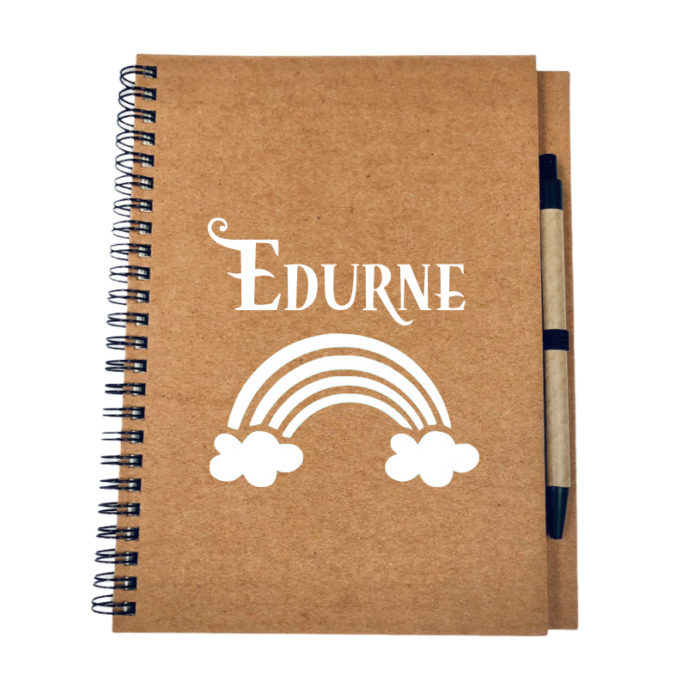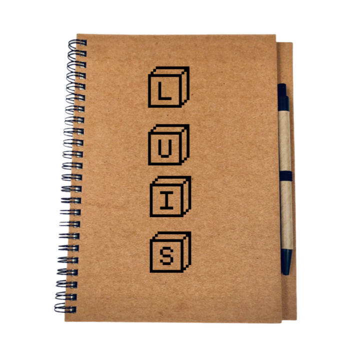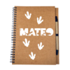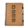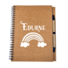 Libreta de anillas con tapas rígidas en cartón reciclado, 80 hojas de disposición a una raya y diseño eco. Bolígrafo de mecanismo pulsador, con cuerpo en cartón reciclado -tinta azul.