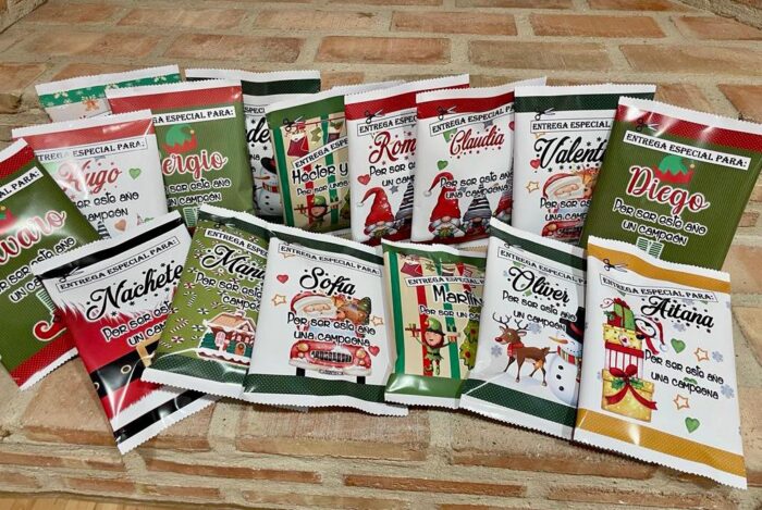 Contiene chuches tipo, conguitos, chocolatinas navideñas, arroz inflado, piruletas, bolsitas de gominolas…