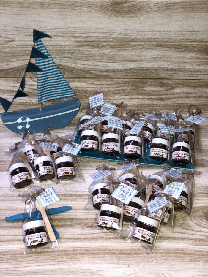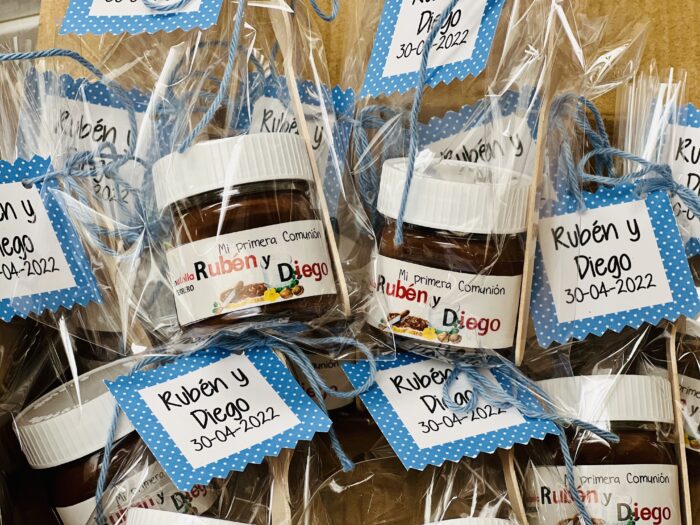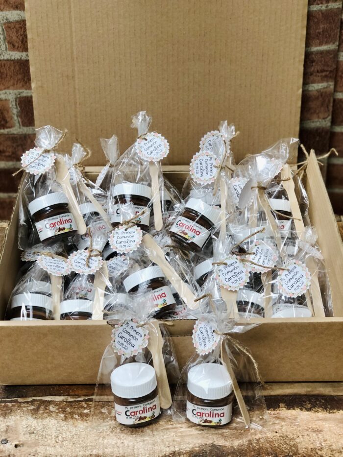 Botes de nutella mini de 25 gr. Personalizados con el nombre que nos indiques, incluye una cucharita de madera. Todo envuelto en bolsita transparente y con etiqueta exterior ,también personalizable.