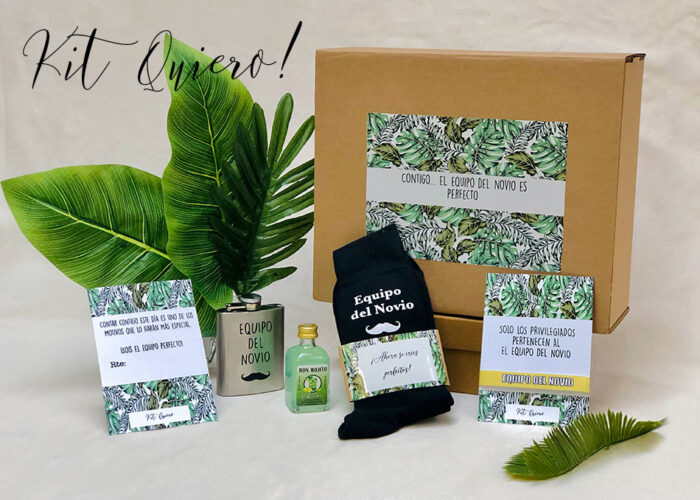 Para ser del equipo del novio no te pueden faltar unos divertidos calcetines en el que pone “equipo del novio”, con los que os haréis una foto grupal chulísima, una botellita mini de mojito para un brindis por vuestro amigo, una petaca molona y una pulsera para ir todos iguales, ¡ahora si seréis el equipo perfecto!
