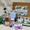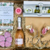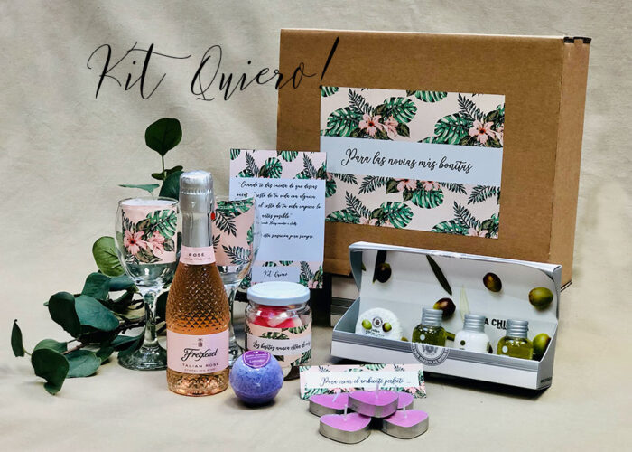 Una preciosa botella de Italian Rosé Mini, delicioso espumoso rosado con delicado aroma a frutos rojos y elegante base de flores blancas, 2 copas de cristal, 1 kit de belleza «La Chinata» cosmética natural de aceite de oliva, 5 velitas en forma de corazón para hacer más íntimo vuestro momento, una bomba efervescente de sales de baño y un bote de besitos de gominola, porque los besitos nunca están de más…