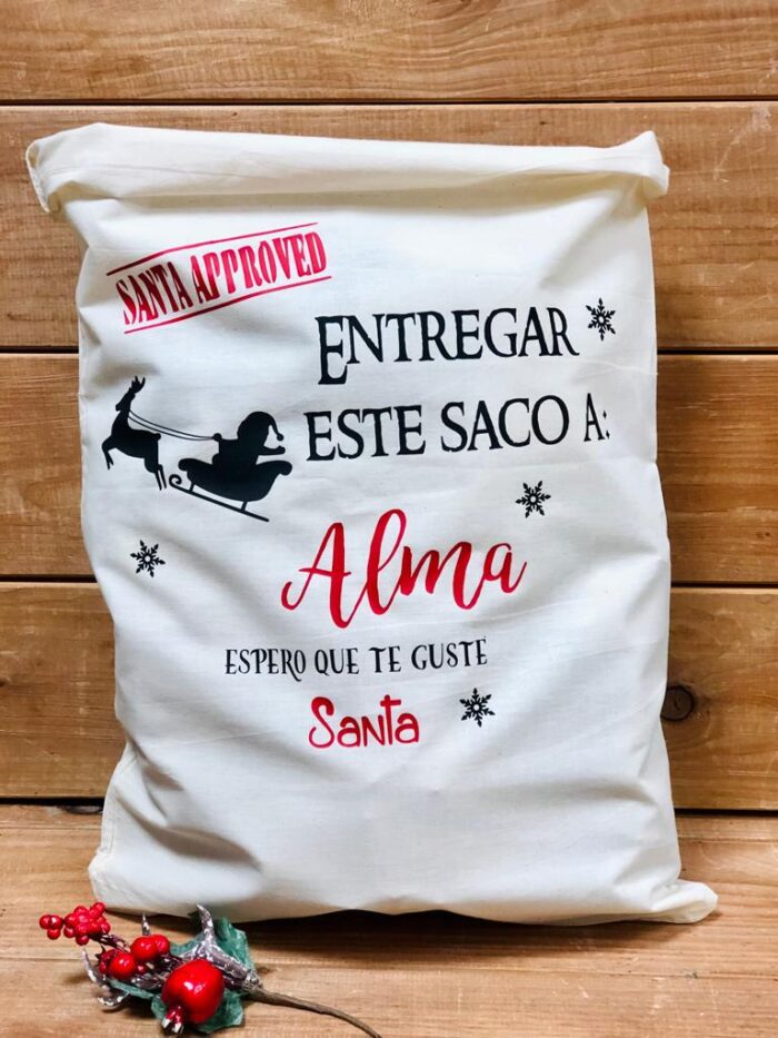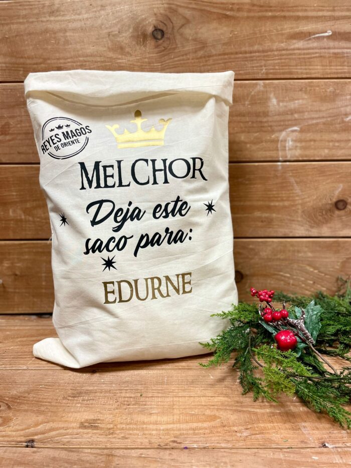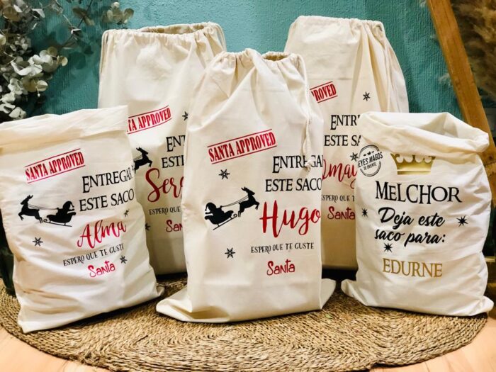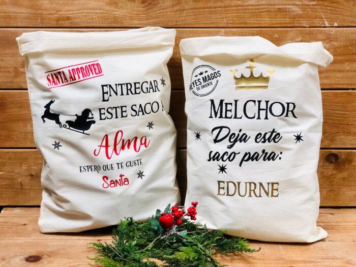 Saco GRAN TAMAÑO navideño de algodón , personalizado con los nombres que nos digas y con diseño de SS.MM.Los Reyes Magos de Oriente o de Papá Noel