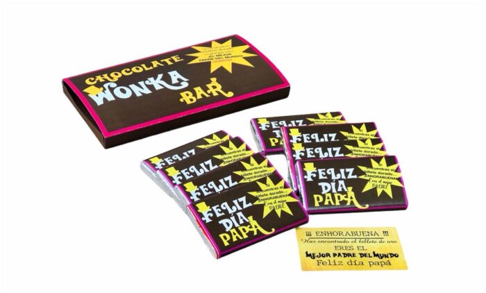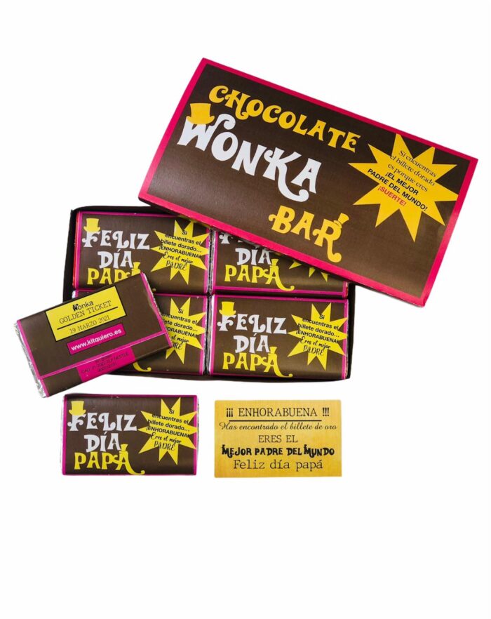 Tableta de chocolate diseño Wonka, con 8 chocolatinas de Nestlé de chocolate con leche en el interior, en una de las chocolatinas se encuentra el billete de oro al mejor ¿ ? … Tu decides quién encontrará el billete de oro, dinos si es para una tía, para una abuela, amigo… y meteremos el billete para esa persona ¡¡ SUERTE!!