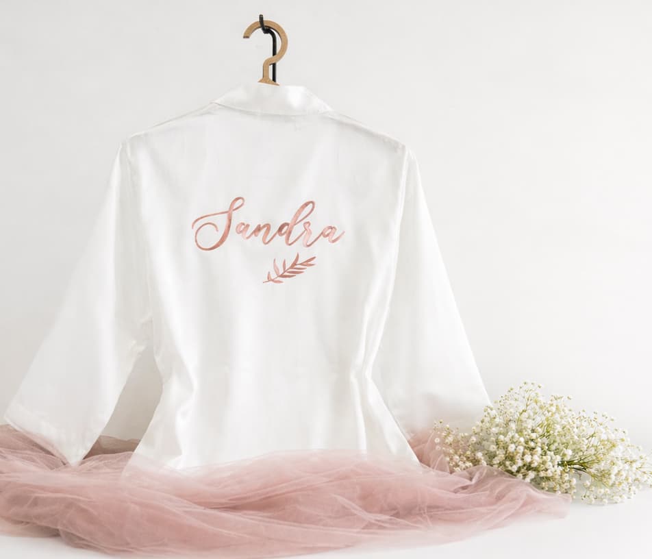 El maquillaje, las risas compartidas, los nervios que ilusionan… y tú, preparándote. Esta bata personalizada está pensada para acompañarte justo ahí, envolviendo ese momento con elegancia, calma y un toque muy personal.