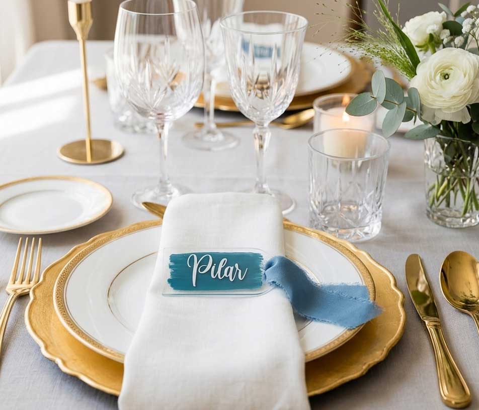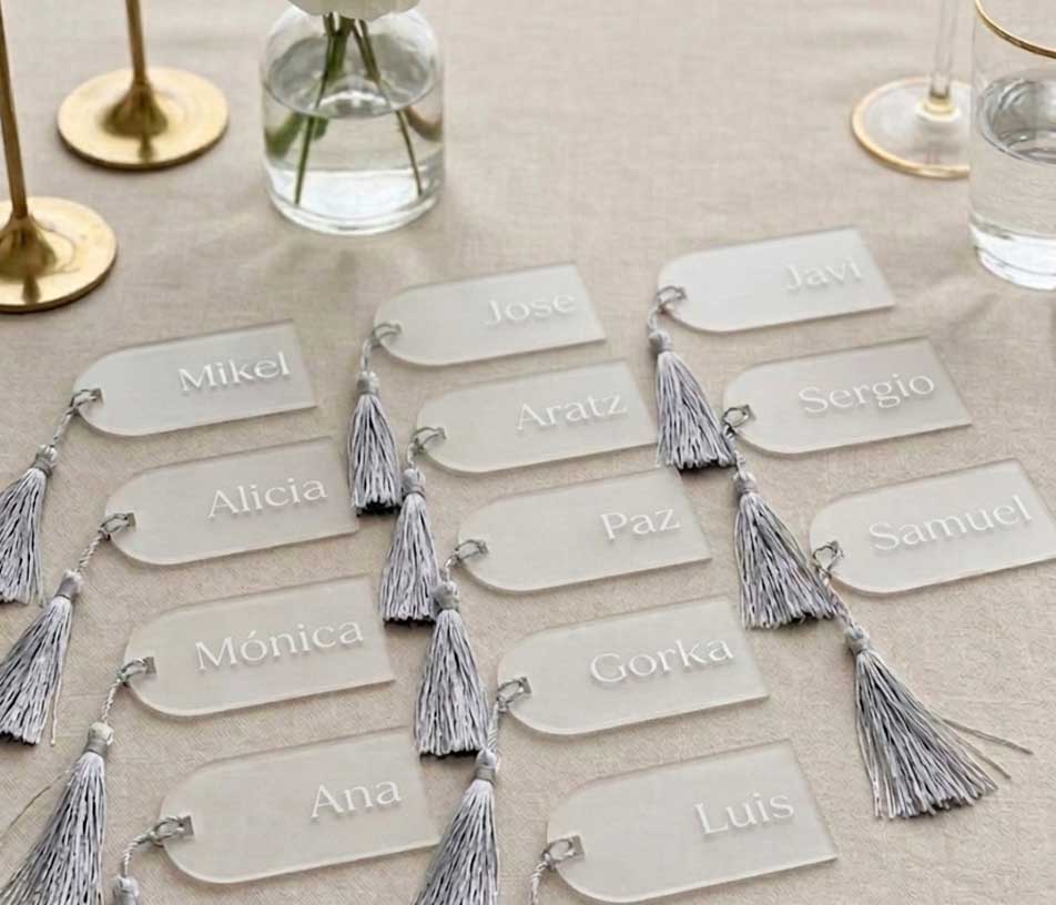 El metacrilato aporta esa mezcla perfecta entre ligereza y elegancia. Transparente o esmerilado, con un sutil toque de color o en su versión más limpia, cada pieza se integra con naturalidad en la decoración, ya sea una boda íntima o un evento más cuidado. El nombre de cada invitado, aplicado en vinilo de alta calidad, convierte cada marcasitio en algo único. Personal, delicado y pensado solo para esa persona. Y el lazo o cinta final añade ese punto artesanal que marca la diferencia.